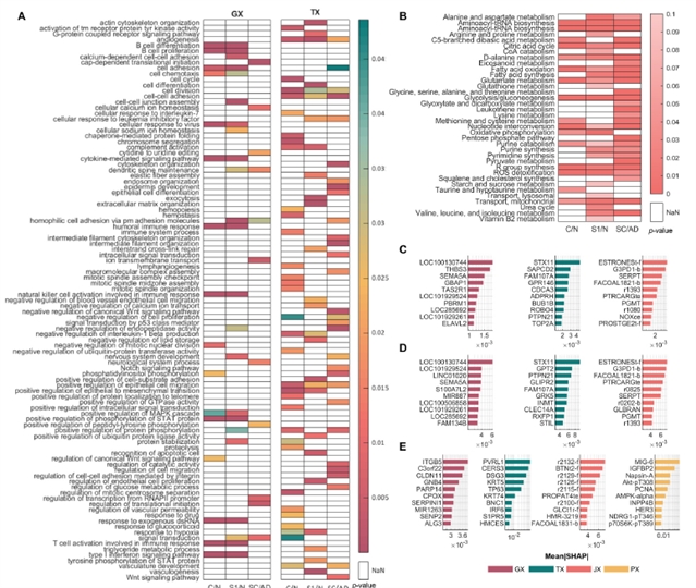 通过SHAP分析(图4),识别出各层面的关键标志物,例如:基因组层面上的THBS3、SEMA5A(调控细胞黏附与血管生成);代谢流层面上的G3PD1、SERPT(反映脂质与碳水化合物代谢重编程)。这些标志物为理解肺癌亚型差异和开发靶向疗法提供了新线索。