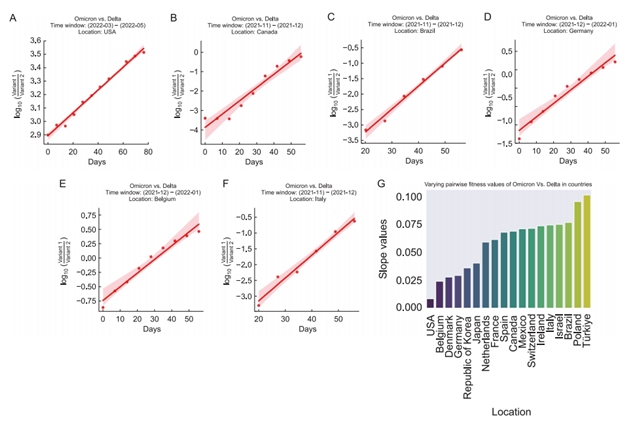 如图2所示,Omicron的扩张速度并非全球一致。 它在土耳其的扩张势头(DPGR=0.1)最为迅猛,意味着相对日增长优势高达10%;而在美国(DPGR=0.008)则缓和得多。这张“速度地图”直观揭示了病毒传播受地域免疫背景、防控措施等复杂因素影响。