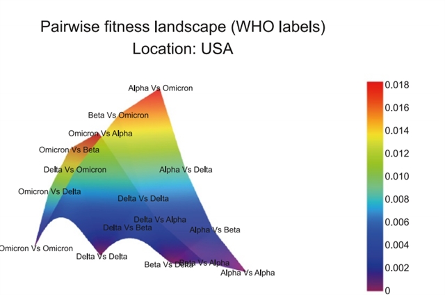 单个比赛的测速结果固然重要,但进化的全景更为壮观。研究团队将所有主要变异株(Alpha, Beta, Delta, Omicron)两两之间的DPGR值,转化为进化距离,并构建了一幅前所未有的三维适应性景观图。如图3所示,这幅地形图将抽象的进化优势变得一目了然。 图中,Omicron变异株稳稳占据了最高峰,表明其相对于所有早期变异株拥有最强的传播适应性。Delta等则位于山腰,而最初的Alpha位于山谷。整幅图生动刻画了病毒为提升传播力而进行的“适应性攀登”,宏观展现了进化趋势。