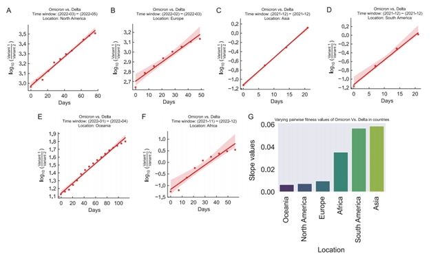 将这把“测速仪”应用于全球基因组数据,可立刻获得病毒传播速度的全球快照。研究重点测量了Omicron取代Delta这场关键“赛事”。