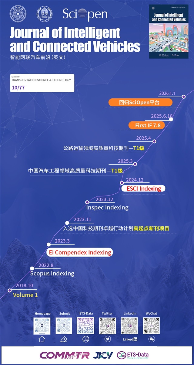 2026年初,由清华大学车辆与运载学院提供学术支持的我国首本智能网联汽车领域英文开放获取期刊《智能网联汽车前沿(英文)》(Journal of Intelligent and Connected Vehicles,JICV)已全面回归清华大学出版社自主研发的科技期刊国际化数字出版平台SciOpen,标志着该刊正式进入自主运营、服务全球学术共同体的新阶段。