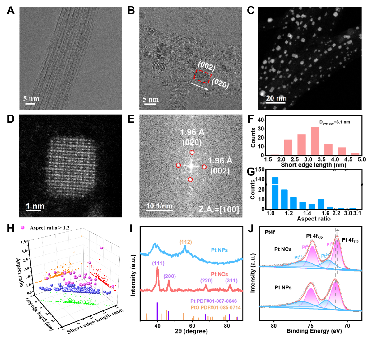 1.沟槽限域与引导:SWCNT束间的沟槽为Pt原子提供了独特的限域空间。理论计算表明,Pt原子沿管轴方向扩散的能垒远低于径向脱离能垒,从而引导形成长边平行于管轴、径向尺寸受控的超细纳米立方。