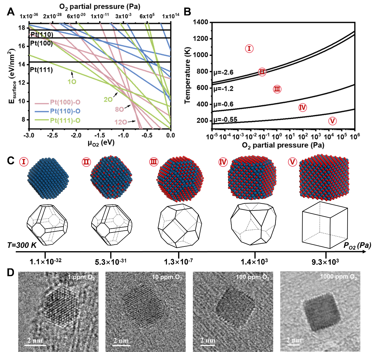 2.微量氧稳定晶面:热处理中引入的微量氧至关重要。计算模拟揭示,氧原子选择性吸附并降低了Pt{100}晶面的表面能,热力学上驱动颗粒向立方体形貌演化。