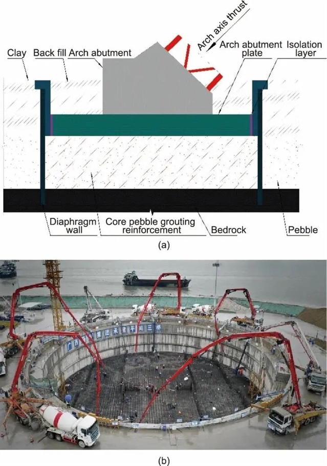 图3 “地下连续墙+注浆加固的卵石层”推力拱桥新型复合基础结构。(a)构造示意;(b)施工实景。