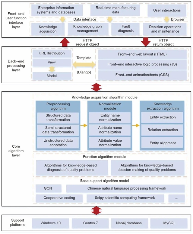 该研究提出了一种基于人机物(Human–Cyber–Physical, HCP)知识图谱的制造过程智能质量控制方法。该方法通过整合人、机、物三元数据,构建了一个系统化的质量控制框架,涵盖了数据管理、本体构建、知识抽取和知识图谱构建等多个环节。这种方法不仅能够实现案例检索、自动分析和辅助决策,还能为质量监控、检查、诊断和维护策略提供全面支持。在实际应用中,该方法已成功应用于汽车生产线和齿轮工程案例,并通过部署的应用系统验证了其有效性。