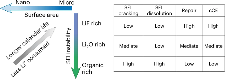 研究表明,硅负极的循环老化和日历老化均源于SEI不稳定。关键在于,两种老化模式虽然由相同机制支配,但具体表现不同:循环衰减主要由硅膨胀收缩引起的SEI开裂主导,而日历老化则主要由长期静置下的SEI溶解驱动,同时SEI开裂也占着重要的位置。该发现澄清了长期争议:提升循环性能是否必然改善存储稳定性,指出二者并非总是正相关,必须同时考虑SEI组成与界面面积效应。