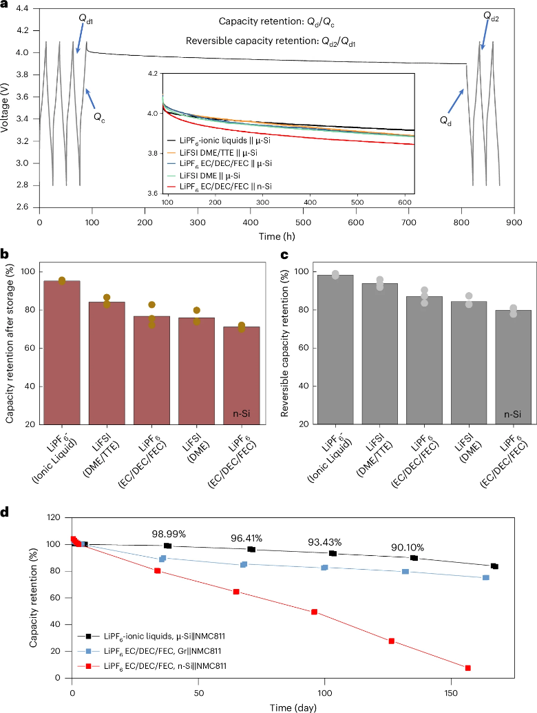 通过引入加速的电压保持(voltage-hold)老化测试方法,并结合多尺度结构与化学表征,研究团队系统比较了不同电解液体系、SEI组成以及硅颗粒尺寸对日历老化行为的影响。结果表明:富含LiF的无机SEI兼具高的silicon-phobicity,低溶解度和高钝化能力,可同时抑制SEI开裂与溶解,使微米级硅负极不仅能达到好的循环寿命还有望使其日历寿命上接近石墨负极。