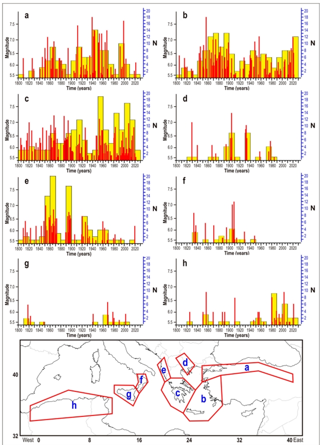 图2.1800年以来的地震活动时间模式。(a)北安纳托利亚断层,(b)安纳托利亚西部和克里特-罗德岛弧,(c)希腊南部,(d)塞尔维亚-马其顿断层系统,(e)伊庇鲁斯逆冲断层前缘和阿尔巴尼亚剪切断层,(f)卡拉布里亚楔形体,(g)西西里岛,以及(h)特尔带。