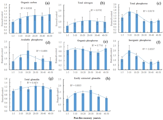 图2.火灾后恢复年限对土壤养分的影响。(a)土壤有机碳;(b)全氮;(c)全磷;(d)速效磷;(e)有机磷;(f)无机磷;(g)总提取球囊霉素;(h)易提取球囊霉素。