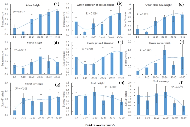 图3.火灾后恢复年限对群落结构的影响。(a)乔木高度;(b)乔木胸径;(c)乔木枝下高;(d)灌木高度;(e)灌木地径;(f)灌木冠幅;(g)灌木盖度;(h)草本高度;(i)草本盖度。