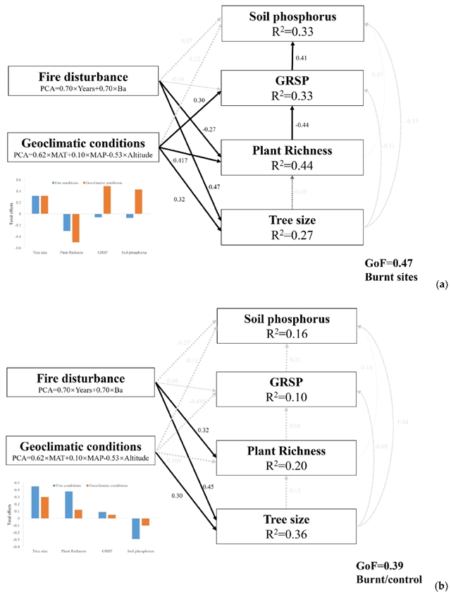 图5偏最小二乘路径模型(PLS-PM)分析了火灾情况和地理气候条件对火烧迹地森林恢复(包括土壤磷、GPSP、植物丰富度和树木大小)(a)和火烧/对照比值(b)的影响。注:箭头宽度表示因果影响的强度。实线箭头:p<0.05,虚线箭头:p>0.05。使用拟合优度(GoF)统计量评估不同结构的模型。
