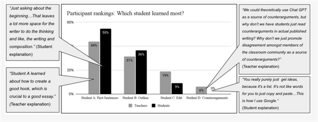 如Figure 1 和Figure 2所示,师生对于四种场景中,最佳ChatGPT使用场景和最糟糕以至于明显作弊的场景展现出了明显分歧。在最佳学习场景中,半数师生有着较为统一的态度,即场景A(仅要求ChatGPT提供开头句)是最佳的ChatGPT使用场景。而场景D(要求ChatGPT直接列出反对观点)是最差的ChatGPT使用场景。