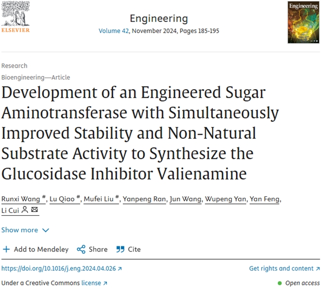 上海交通大学 技术学院崔莉团队在《Engineering》发表了一篇题为“Development of an Engineered Sugar Aminotransferase with Simultaneously Improved Stability and Non-Natural Substrate Activity to Synthesize the Glucosidase Inhibitor Valienamine”(同时提升糖氨基转移酶热稳定性及对非天然底物催化活性实现糖苷酶抑制剂井冈霉烯胺的高效合成)的研究成果,王润希、乔路、刘慕非为论文共同第一作者。研究团队针对糖氨基转移酶WecE的性能瓶颈,通过定制化的酶分子进化策略,为糖苷酶抑制剂井冈霉烯胺的生物合成提供了新方案。