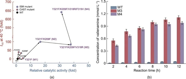 图5 以野生型WecE为起始的稳定性-活性进化途径,以及突变体M3、M4与野生型WecE的井冈霉烯胺预制备比较。(a)在CAST过程和ISM循环中,WecE从野生型出发对非天然底物井冈霉烯酮的稳定性和活性同步进化路径;(b)在50 mg制备规模反应中,对表现最佳的突变体M3、M4以及野生型WecE在12 h内的井冈霉烯胺产量进行了测定。