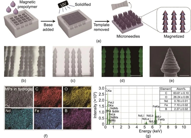 针对这些问题,研究团队提出了可控组织切割技术,其核心是3D打印的榫卯结构切割装置与加载磁性颗粒的宝塔状微针阵列支架。该微针支架由磁性微针阵列和非磁性基材组成,制备过程中先通过3D打印机打印有序微针阵列的3D模具,经Ecoflex硅橡胶脱模获得阴模,再向阴模中注入含钕铁硼(NdFeB)磁性粒子的预聚物,经紫外辐射固化后完成制备。所制微针共由六个层级构成,总长度约为1400 μm,每一层的高度与底部直径分别集中在230 μm与188 μm左右,足以完全穿透组织样本。