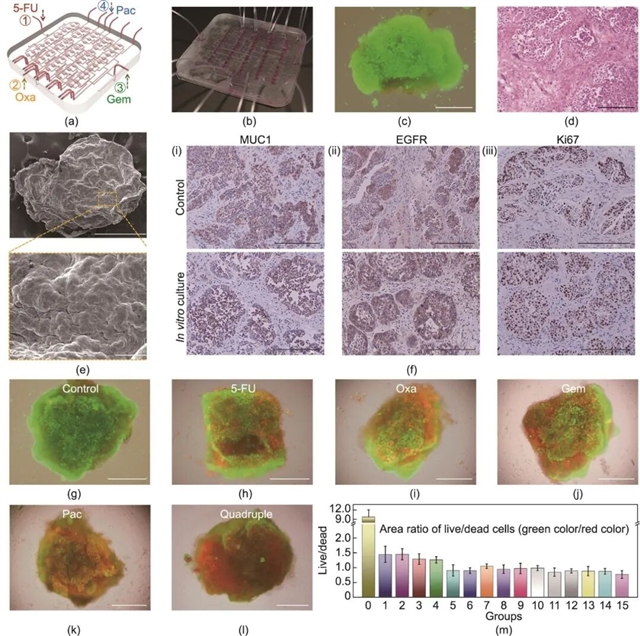 图5 微流控辅助抗癌药物筛选。(a)微流控芯片结构示意图,四种输入药物分别为5-FU、Oxa、Gem与Pac;(b)带有胰腺癌组织块的微流控芯片实物图;(c)培养3天后的胰腺癌组织块明场/荧光融合图像;(d)培养组织块的H&E染色图像;(e)培养组织块的SEM图像;(f)新鲜小鼠肿瘤组织与体外培养组织的免疫组织化学染色图像,包括MUC1(i)、EGFR(ii)与Ki67(iii);无药处理(g)、单药处理[(h)~(k)]以及联合用药(l)下的组织块明场/荧光融合图像,分别为5-FU(h)、Oxa(i)、Gem(j)、Pac(k)、四药联用(l);(m)各组组织块中活细胞与死细胞面积比值统计。组别说明:组0为对照组(未处理),组1~15依次对应不同单药及多药组合。比例尺:(c)、(e)上半部分和(g)~(l)为500 µm,(d)、(f)为200 µm,(e)下半部分为50 µm。