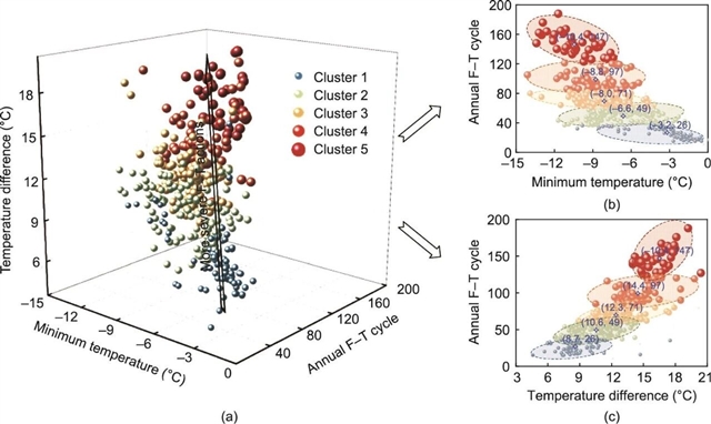 图3 基于K-means的冻融作用聚类:(a)三维聚类散点图;(b)在x-y上的投影;(c)在y-z上的投影。x, y, z:笛卡尔坐标系的坐标轴。