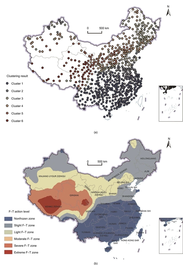 在区划方法上,研究采用K-means聚类算法,对403个存在冻融作用的站点按“年均冻融循环次数、累年平均日最低温度、累年平均日温差”三维指标进行聚类,结合普通克里金空间插值,最终将全国划分为无冻融区、微冻融区、轻度冻融区、中度冻融区、严重冻融区和极端冻融区六个等级。极端冻融区主要分布在青藏高原大部分地区,其平均年冻融次数147次,平均冻结温度−10.4℃,平均冻融温差16.4℃。