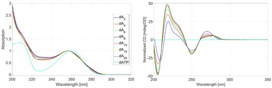 图1:腺嘌呤寡核苷酸链(d(A)n)与单体dATP的吸收(左)和圆二色(右)光谱对比