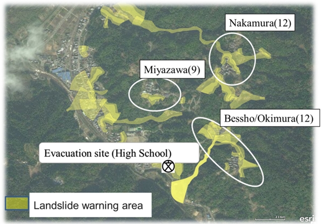 图1.调查地点A包括中村地区(12户)、宫泽地区(9户)和别所/冲村地区(12户),所有这些地区都位于滑坡预警区(黄色区域)。