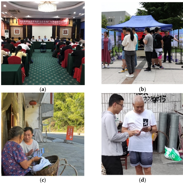 图2.防灾知识普及。(a)开展学习项目。(b)在大学校园内普及防灾知识。(c)向当地村民讲解防灾知识。(d)实施防灾培训。