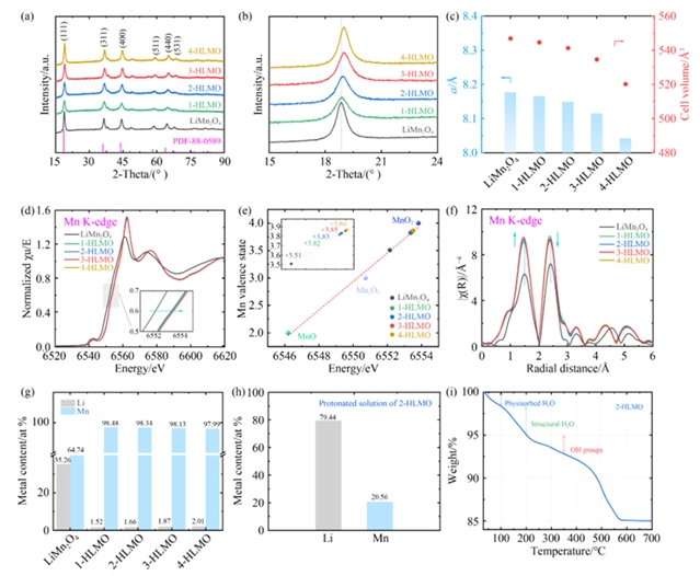 XRD显示随质子化程度增加,衍射峰向高角度偏移,晶胞逐渐收缩。XANES证实Mn氧化态系统性升高,EXAFS揭示Mn–O键缩短、配位数增加。ICP-OES检测到Li大量浸出(从35.26%降至~1.5-2%),而TG分析证实H+掺入(失重5.54%)。