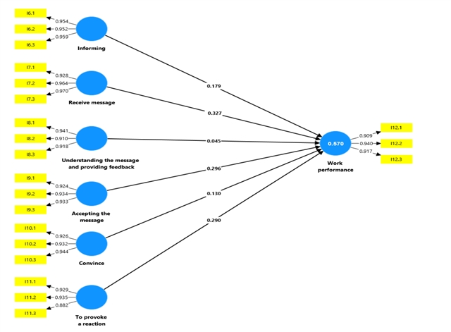 有效估计模型(PLS 算法图)。该图直观呈现了六大沟通维度与员工绩效之间的路径关系及模型解释力(R²=0.570),清晰展示了各潜变量的测量题项与因子载荷,是模型关系的可视化表达。
