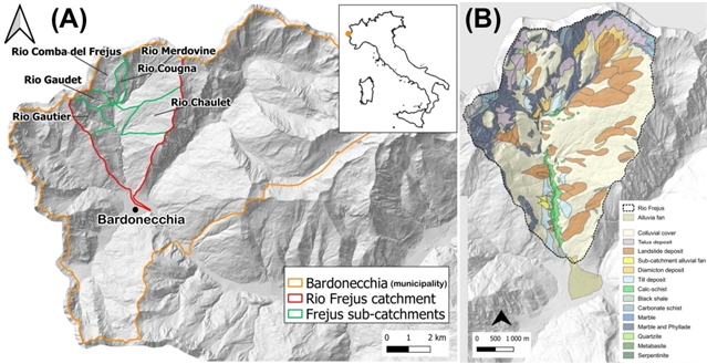 图1.(A)位于巴尔多内基亚市的里奥弗雷尤斯河集水区及子集水区(橙色边框)。(B)里奥弗雷尤斯河区域地质概况图。