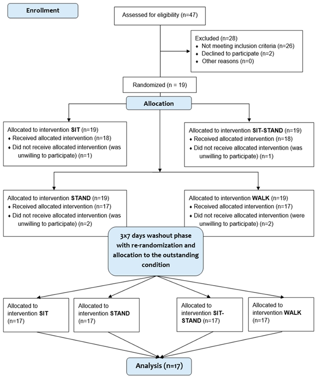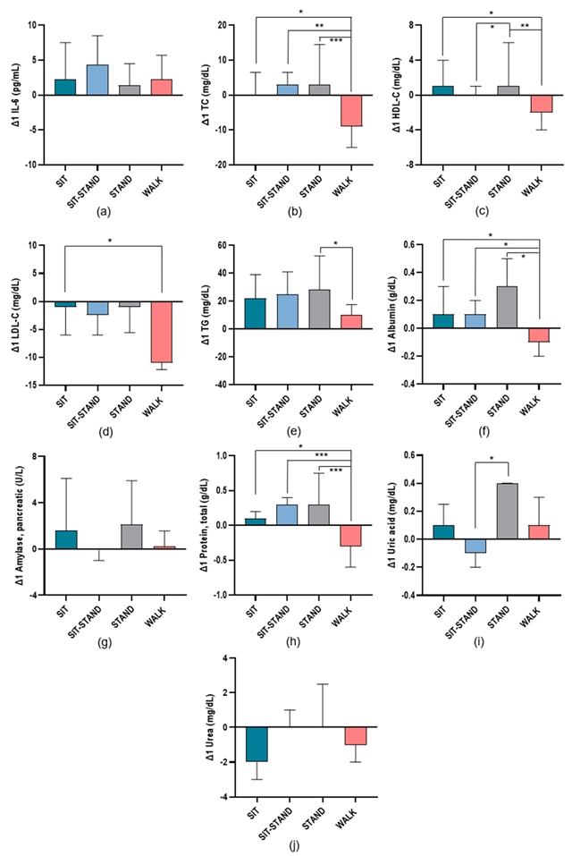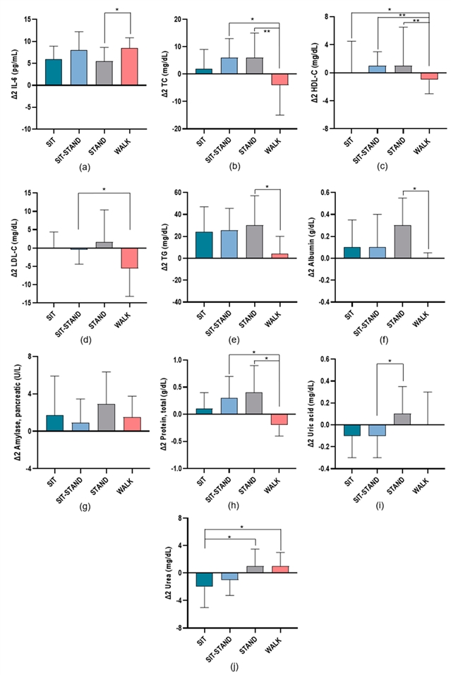 这项研究的重点是描述与不间断的久坐相比,LIPAS如何影响炎症和心脏代谢风险标志物。17名超重及肥胖的年轻成年人参与了本研究。受试者被随机分配至以下实验组别,并在8小时模拟工作日期间进行测试:持续久坐组(SIT)、坐立交替组(SIT-STAND,累计站立2.5小时)、持续站立组(STAND)及持续步行组(WALK,1.6公里/小时)。各组别均包含标准化非相对化早餐与午餐。在空腹状态下采集静脉血样:基线时(T0)、午餐后1小时(T1)及基线后8小时(T2)。检测的炎症与心脏代谢风险标志物包括:白细胞介素-6(IL-6)、C反应蛋白(CRP)、总胆固醇(TC)、高密度脂蛋白胆固醇(HDL-C)、低密度脂蛋白胆固醇(LDL-C)、甘油三酯(TG)、内脏脂肪面积(VFA)、甘油三酯-葡萄糖(TyG)指数、两项脂质比值指标(TG/HDL-C与TC/HDL-C)、白蛋白、胰酶、总蛋白、尿酸及尿素。