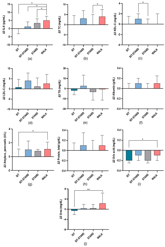 图3. 每种状态下的炎症和心脏代谢风险标志物变化Δ1(T1−T0):(a) IL-6;(b) TC;(c) HDL-C;(d) LDL-C;(e) TG;(f) 白蛋白;(g) 胰酶;(h) 总蛋白;(i) 尿酸;(j) 尿素。