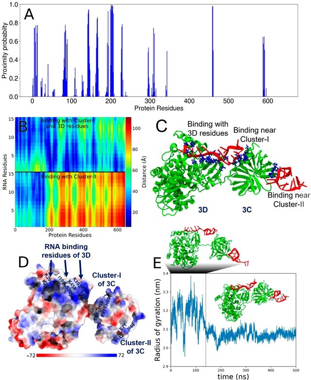 图5. 分子动力学模拟揭示PV-3CD蛋白与RNA-1的相互作用