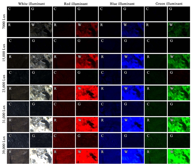图 不同光源照射下煤矸石的局部子图像(C—残余煤;G—灰色矸石;R—红色矸石;W—白色矸石)。