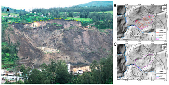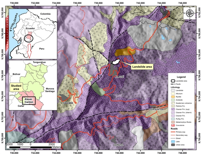 图2.研究区域的大致位置(在厄瓜多尔地图和钦博拉索省地图中显示在左侧的矩形框内)以及滑坡区域及其周围环境的地质图。