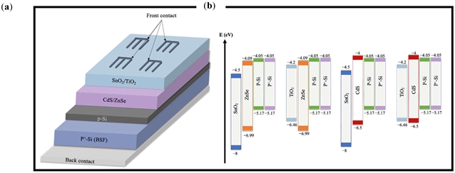 (1)为了提升太阳能电池的效率和可持续性,硒化锌(ZnSe)和硅(Si)发挥着不可或缺的作用:它们兼具稳定性与透明度的优势,同时凸显了材料的丰富储量。本研究利用SCAPS_1D工具探索不同异质结结构,旨在解析关键参数与光伏性能之间的微妙关联,从而为可持续能源解决方案的进步做出重要贡献。