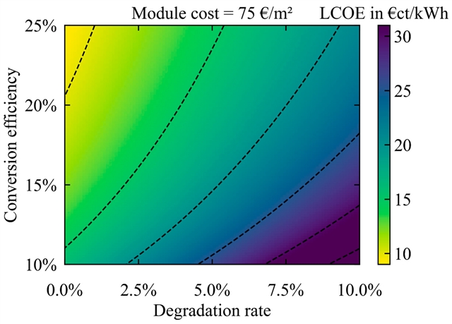 (2)若2035年转换效率能提升至25%,衰减率降至1%以下,且组件成本为50欧元/平方米,钙钛矿光伏的LCOE或将降至约8欧分/千瓦时。随着组件成本的进一步降低,LCOE将持续下降,使其与晶体硅光伏的成本竞争力日益凸显。
