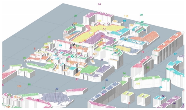 (2)研究方法整合了基于地理信息系统(GIS)的空间与形态数据,并运用聚类框架应对二氧化碳排放、空气污染及能源效率低下等挑战。在现行城市规划法规框架下,分析了屋顶可用性及光伏设计约束条件。空间分析融合了建筑几何形态与日照辐射数据,同时借助Grasshopper平台的进化优化算法,对阴影遮挡分析、发电量及财务绩效进行了精细化处理。聚类方法(K-means与三维邻近聚类)依据太阳辐照均匀性与空间连贯性对光伏板进行分组,以提升系统效率。