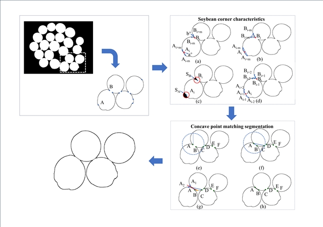 作者提出了基于角点多特征的大豆籽粒分割算法。通过ORB算法检测出角点作为候选点,随后提取矢量夹角,三角形矢量面积,圆形模块中的黑色像素面积,一阶差分链码作为角点特征。通过LightGBM机器学习模型对角点特征进行学习,筛选出凹点与非凹点。保留凹点。通过凹点匹配算法,匹配相对应的凹点,连接凹点,完成大豆分割,得到单粒大豆。构建完整粒、破碎粒、表皮损伤粒、未熟粒和斑点粒五种类别的大豆数据集。