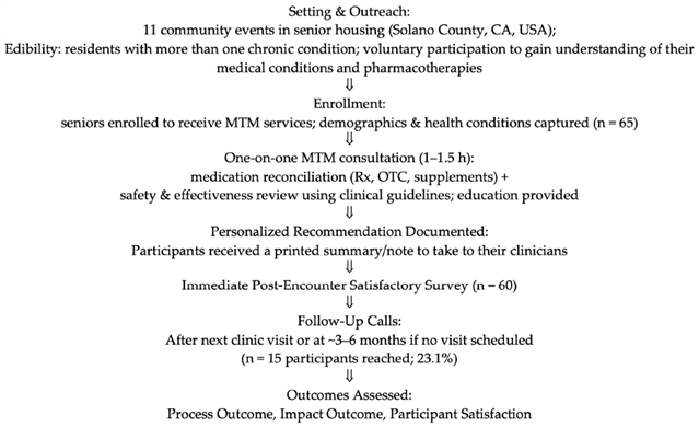 Pharm2Home倡议旨在提升加州索拉诺县医疗服务不足人群的慢性病管理水平和药物治疗利用率。社区健康项目于2022年1月启动,将临床药学服务扩展至未在合作诊所就医的个人。其咨询服务旨在 (1) 向老年人普及慢性病知识,并介绍药物治疗方案;(2) 评估老年人当前慢性病药物治疗方案的安全性和有效性。采用一对一咨询的方式,每次咨询时长为1至1.5小时。咨询过程基于药剂师患者护理流程(PPCP),共包括七个步骤:准备、药物核对、临床评估、教育、行动计划分享、文档记录和后续跟进。参与者接受关于其药物和慢性疾病的教育,所提供的建议均基于最新的临床指南。参与者的纳入标准包括管理一项或多项慢性疾病、居住在低收入老年住房,以及提供知情同意。会诊由临床药师、药学住院医生和学生共同进行,记录参与者的人口统计信息、慢性病状况和药物使用历史。研究采用便利抽样的方法,进行描述性统计分析。调查采取口头形式,以确保准确记录回应。后续电话用于评估建议的实施情况。