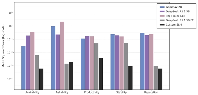 实验过程分为两个主要部分。第一部分是SLM性能评估,将提出的定制SLM与多个现有的流行模型进行对比,包括Gemma2 2B、DeepSeek R1 1.5B、Phi-3-mini 3.8B及其微调版本。评估指标采用均方误差来衡量模型预测的五个指标值与IEEE标准计算出的真实值之间的偏差,同时还对比了各模型在磁盘占用和运行时内存方面的计算开销。