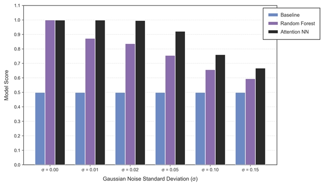 即使在高噪声水平下,带注意力机制的神经网络在 AUC 分数上也始终与随机森林模型持平,而基线模型保持平坦。