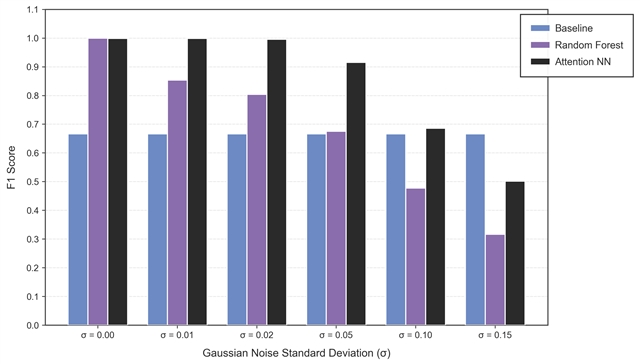 随机森林和带注意力机制的神经网络在噪声增加时性能逐渐下降。然而,即使在高噪声水平下,带注意力机制的神经网络仍保持优异的 F1 分数。