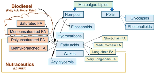 在微藻细胞中,脂质以结构脂质和储存脂质的形式存在于液滴之间。这些脂质分为两类:极性脂质和非极性脂质。非极性脂质,也称为中性脂质或储存脂质,包括三酰甘油、二酰甘油、单酰甘油、游离脂肪酸、烃类和其他色素。在正常生长条件下,微藻产生大量的生物质,但不会积累大量的脂质等高价值代谢物。通常,大多数藻类的脂质含量占其干重的20%至50%。脂肪酸组成是决定生物柴油原料功效的关键因素之一。与植物来源的脂质相比,微藻来源的脂质具有更加多样化的脂肪酸组成。微藻主要产生碳链长度为12、16和18的脂肪酸;然而,某些物种可以合成碳原子数高达24个的脂肪酸。大多数微藻物种中常见的脂肪酸包括肉豆蔻酸(C14:0)、棕榈酸(C16:0)、硬脂酸(C18:0)、油酸(C18:1)、亚油酸(C18:2)和亚麻酸(C18:3)。长链多不饱和脂肪酸(PUFA)因其健康益处而在营养保健品和食品行业备受重视,但饱和脂肪酸(SFA)和单不饱和脂肪酸(MUFA)才是生物柴油生产的首选。高含量的PUFA,例如C18:2和C18:3,会降低十六烷值,从而导致点火性能差。相反,富含SFA和MUFA的短链脂肪酸可以提高生物柴油的能量产率、十六烷值以及氧化稳定性和热稳定性,然而,PUFA的含量在不同微藻菌株间差异显著(从不足3%到接近69%),可能会对生物柴油的质量产生负面影响。生物燃料的品质主要取决于特定脂肪酸的存在,包括棕榈酸 (C16:0)、硬脂酸 (C18:0)、油酸 (C18:1)、亚油酸 (C18:2) 和亚麻酸 (C18:3)。富含油酸 (C18:1) 的生物柴油因其优异的燃料特性而备受关注,包括良好的点火性能、氧化稳定性、燃烧热、低温滤点、粘度和润滑性。
