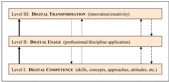 数字素养框架(Martin & Grudziecki, 2006)该框架将数字素养分为三个相互关联的层级,一级为数字能力(技能、概念、方法、态度等),二级为数字应用(专业 / 学科场景落地),三级为数字化转型(创新 / 创造力赋能),是中小企业培育数字素养的核心理论依据。)
