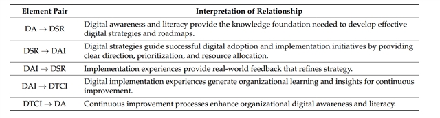 解释性矩阵。该矩阵阐释了四大要素间的相互作用逻辑,如数字意识为数字战略制定奠定知识基础、技术实施经验反向优化战略规划等,揭示了 DASAT 框架的循环互动本质。