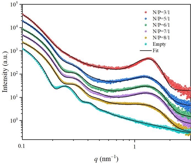 本研究基于同步辐射SAXS技术,发展了一种球形“球形核-三壳层”结构模型,能够同时解析LNP的核心区、内层脂质壳、中间亲水头基层以及外层PEG冠的结构参数。通过对比分析空载LNP与mRNA负载LNP的实验数据,发现mRNA的引入显著增加了体系的多分散性,改变了中间壳层的散射对比度,并导致PEG冠层密度明显升高,反映出核心收缩与表面结构重排效应。进一步系统考察了不同N/P条件下LNP的结构演化规律,发现随N/P升高,颗粒尺寸均一性提高,但核酸–脂质复合结构的周期有序性逐渐减弱,指示存在兼顾包封效率与结构稳定性的最优N/P区间。该研究验证了同步辐射SAXS在复杂纳米药物体系结构表征中的独特优势,为核酸递送载体的理性设计与质量控制提供了定量化结构依据。