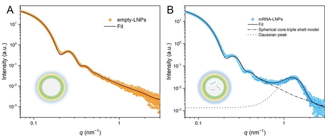 研究发现,对于空载LNPs,σ/R0等于0.10(σ表示标准差,R0表示平均半径),表现出良好的单分散性,内部混合脂质膜层的厚度(t1)为2.04 nm。对于mRNA-LNPs,σ/R0略有增加,说明单分散性有所下降;t1略有减小(1.85 nm),亲水头基层的散射长度密度下降了20%。mRNA与阳离子脂质(ALC-0315)在LNP内部形成周期距离为4.94 nm的组装结构,显著影响了膜层中脂质分子间的相互作用。