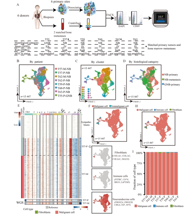 神经母细胞瘤是儿童最常见的颅外实体肿瘤,约占儿童癌症相关死亡的15%,其起源于神经嵴细胞异常发育,具有高度异质性,从局部无症状肿瘤到广泛转移的恶性疾病不等。60%的患者在诊断时已处于高危状态并伴随转移,尽管过去二十年儿科癌症治疗取得显著进展,但高危神经母细胞瘤患者的5年生存率仍低于50%。目前,虽然通过动物模型发现了一些与转移相关的分子机制,但转移起始细胞的特性及原发与转移灶之间的转录组差异在单细胞水平上仍不明确,这限制了对转移机制的深入理解和靶向治疗策略的开发。