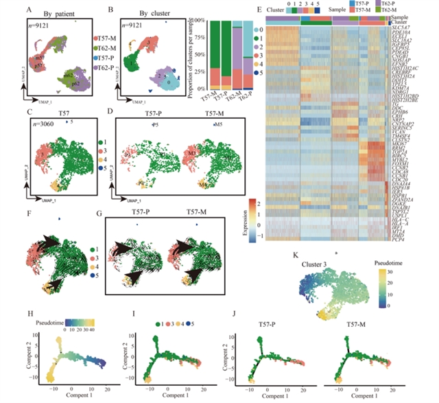 为探究转移的进化轨迹,研究聚焦于包含原发和转移灶匹配样本的T57和T62病例,排除非恶性细胞后进行整合UMAP分析。结果显示,恶性细胞主要按肿瘤起源聚类,但Cluster 3在两个病例中均匀分布,且包含原发和转移灶细胞,提示了其在转移中的保守性(图2)。通过RNA速率分析、Monocle2和Slingshot轨迹推断,发现Cluster 3位于轨迹起始点,具有更高的干细胞特性(信号熵和转录多样性),被命名为“起始”亚群。结合单细胞突变分析(T57病例),构建系统发育树显示Cluster 3具有最多样化的突变,骨髓转移灶突变数量多于原发肿瘤,且与原发Cluster 3共享相似突变模式,支持转移起始细胞来源于原发灶Cluster 3(图3)。