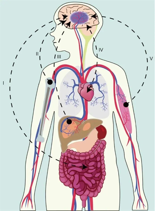 图1 大脑与外周器官的相互作用:Ⅰ:脑-肠轴;Ⅱ:脑-骨轴;Ⅲ:脑-肝轴;Ⅳ:脑-心轴;Ⅴ:脑-骨骼肌轴。