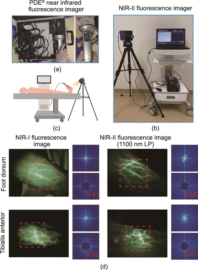 图2 NIR-I和NIR-II荧光成像系统及其性能比较。(a)PDE®近红外荧光成像仪实物图;(b)我们实验室自建的NIR-II手术导航系统实物图;(c)手术过程中获取NIR-II荧光图像的示意图;(d)患者足背和胫骨前肌区域血管的NIR-I和NIR-II荧光图像(1100 nm长通窗口),以及经过FFT处理后,对应代表性区域(用红框标记)的频谱图。红色数字表示每张频谱图中高频信息的占比。